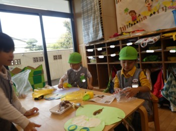 木育の一環として、年中クラスではフクロウを自分たちが拾ってきた落ち葉で製作しました。先週、行船公園で本物のフクロウを見に行ったばかり、みんなイメージバッチリで夢中で取り組んでいました。