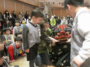 今年もあすなろに獅子舞が来てくれました!演じてくださるは地元の斎藤様、ペットボトルをくわえるなど多彩な技を見せてくださいました。お正月にお獅子に噛まれると福が来る!ということで、最後は子ども達の中へ!!進んで頭や手を差し出す子もいれば、泣いちゃう子も。新年早々すごーく可愛かったです?
